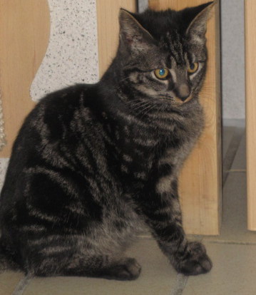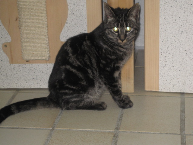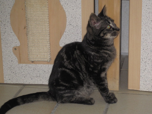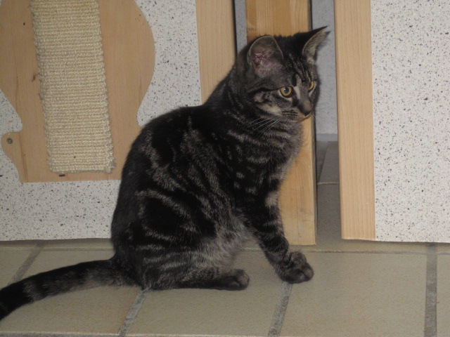 Arrow ist noch etwas vorsichtig, was Menschen betrifft, vergisst dies aber, wenns ums Spielen geht. Er ist eher ein Zuschauer und muss noch etwas animiert werden. Fangen die anderen Katzen an zu toben, gesellt er sich zu ihnen und möchte mitspielen.