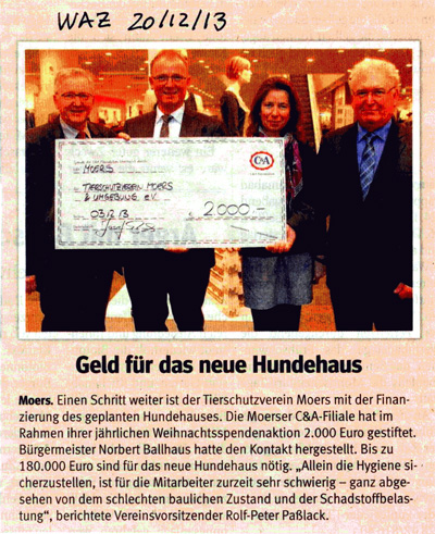 Die WAZ und die RP berichteten über die Finanzierung des neuen Hundehauses und die Unterstützung der Moerser C&A-Filiale.