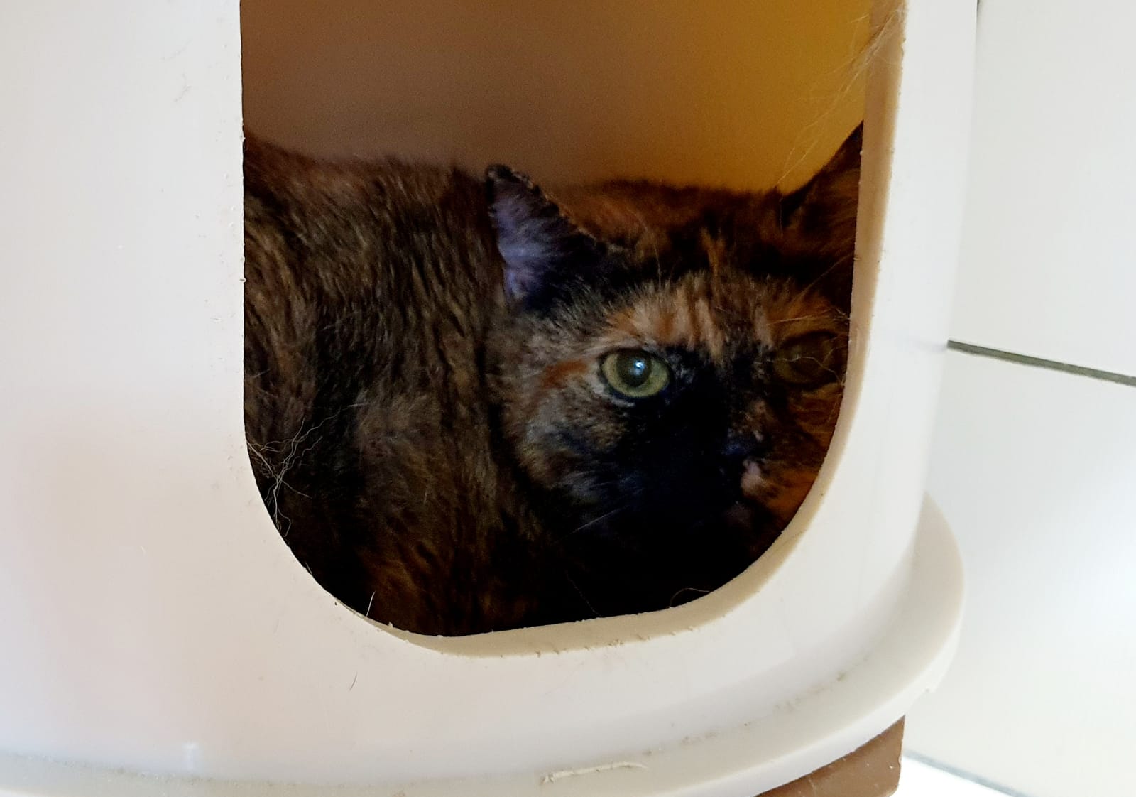 Daisy ist ins Katzenhaus umgezogen, wo sie noch sehr versteckt die neue Welt betrachtet. Sie ist auf jeden Fall eine Katze, die im neuen Zuhause genug Zeit braucht, um sich einzuleben. Sie muss erst wieder Vertrauen aufbauen, braucht also Menschen, die sie in ihrer Art respektieren.