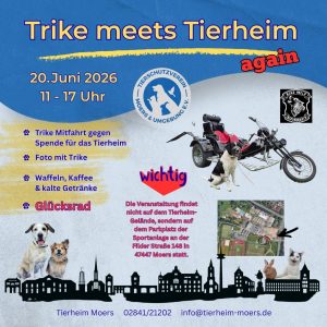 Am 20. Juni 2026 bieten die Triker und Biker von Road Wolf Niederrhein von 11 – 17 Uhr Mitfahrten auf dem Trike für den guten Zweck an. Die Erlöse aus den Trikefahrten kommen zu 100 % den Tieren aus dem Moerser Tierheim zugute.