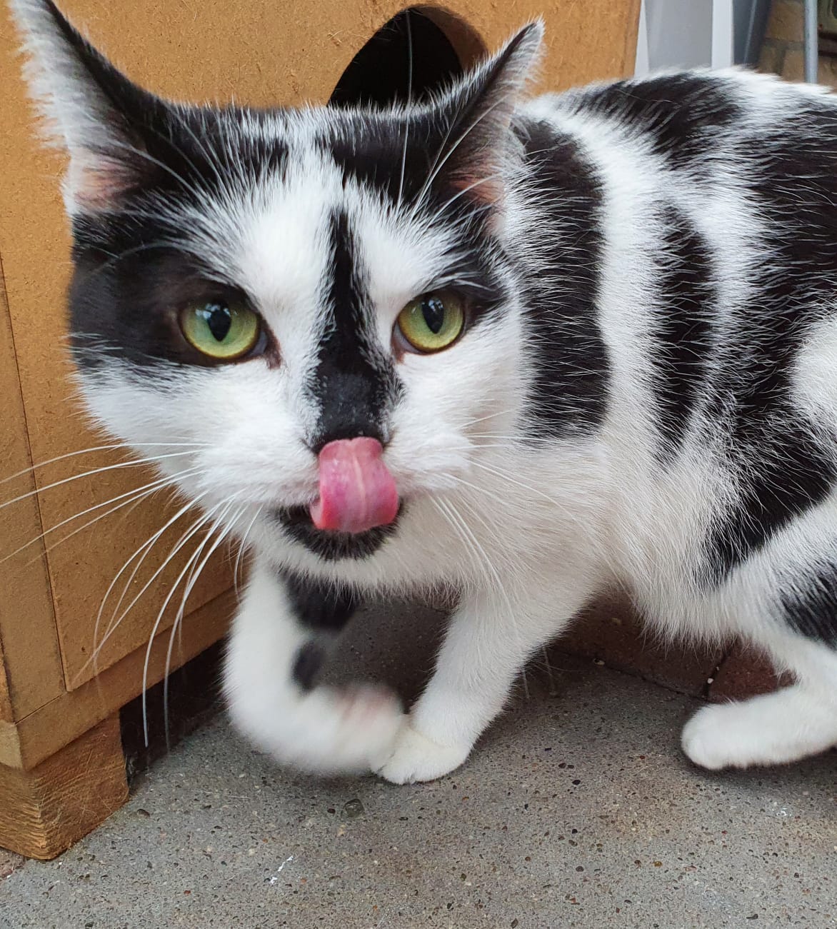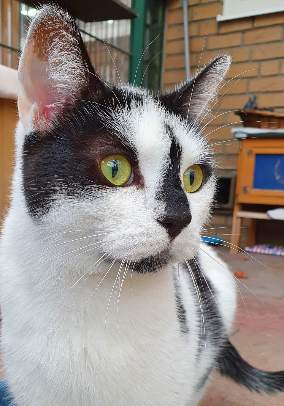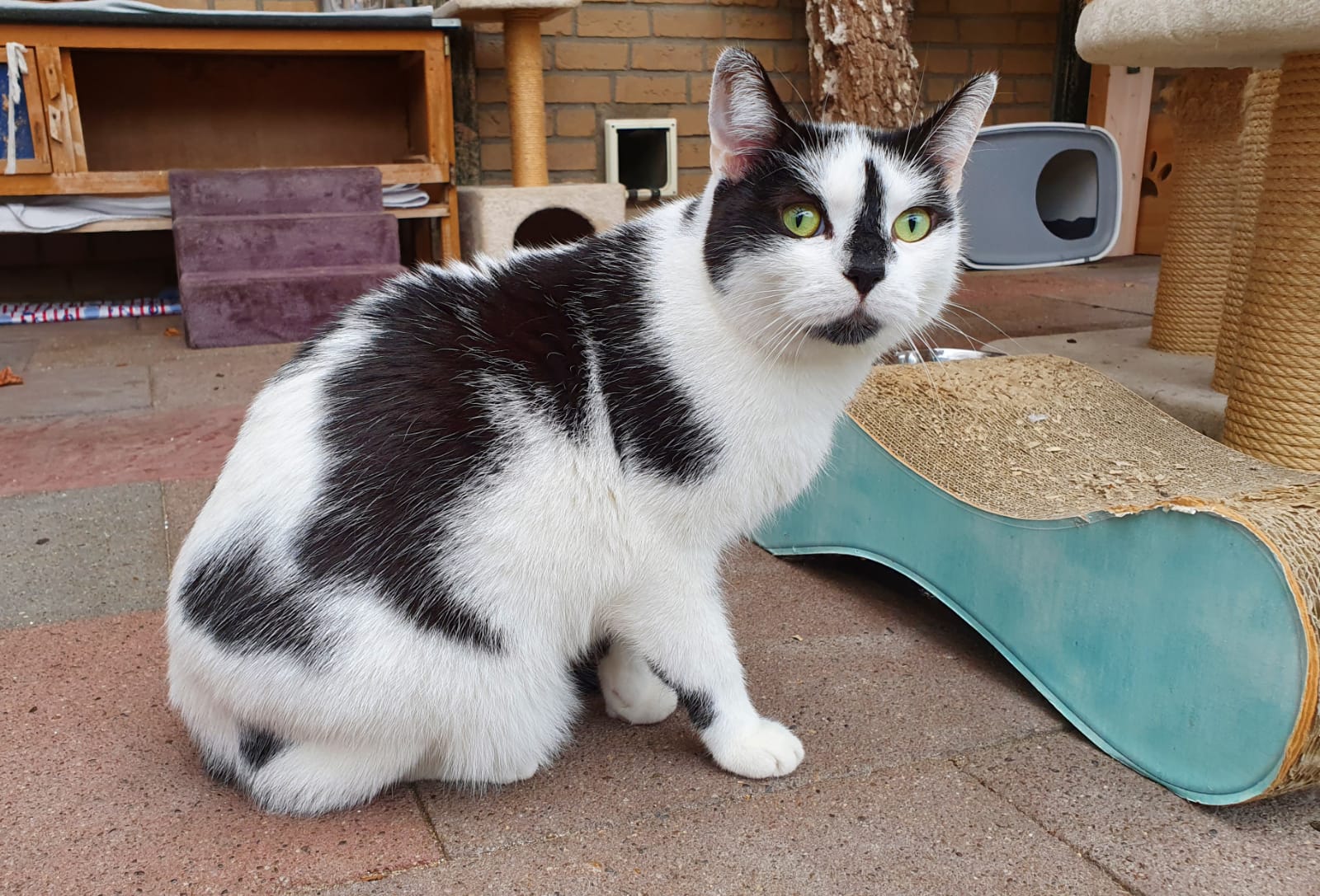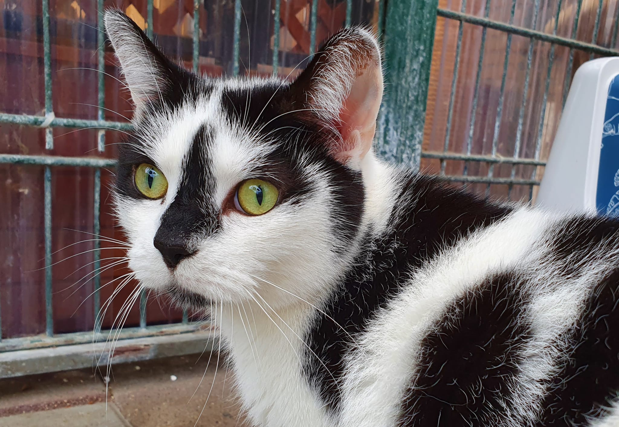 Clemens ist ins Katzenhaus umgezogen und muss sich dort erst mal orientieren. Im Freigehege hat er sich eine schöne Kiste ausgesucht, aus der er aber bei Ansprache auch herauskommt, um sich mit Streicheleinheiten verwöhnen zu lassen. Vor anderen Katzen hat er erst mal etwas  Respekt, vor allem, wenn sie selbstbewusst auftreten, wie unsere Panini. Auch die vielen neuen Geräusche im Tierheim kommen ihm erst mal noch befremdlich vor. Aber er ist auf einem guten Weg, sich mit allem zu arrangieren. Die Möglichkeit zum späteren Freigang muss im neuen Zuhause vorhanden sein.