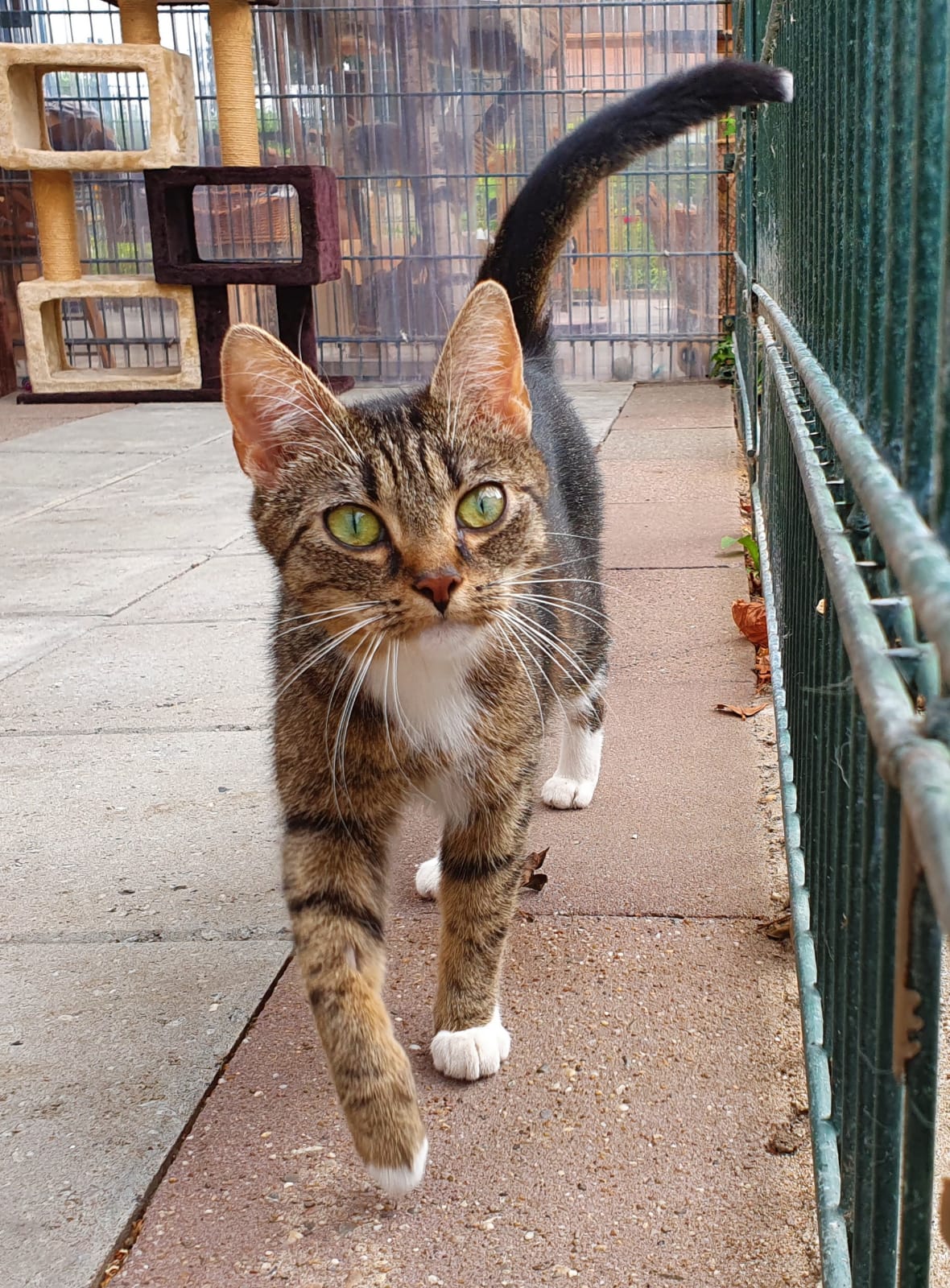 Diese zierliche Katze hat es faustdick hinter den Ohren. Da sie so klein und hilfslos wirkt, weckt sie sofort den Beschützerinstinkt … das ist aber gar nicht notwendig, denn die kleine Lady weiß sehr gut, was sie möchte, und auch, was sie nicht möchte. Sie zeigt sich schmusig und lockt ihre Menschen damit an, um dann mit ihnen ihr Spiel zu spielen. Dabei stehen Beine und Füße im Mittelpunkt, die häufig das Ziel ihrer Begierde sind. Vielleicht wurde sie da früher falsch angeleitet. Abwechslungsreiches Spielzeug und viel Beschäftigung in Verbindung mit Freigang wird sie hoffentlich in die richtige Richtung führen.