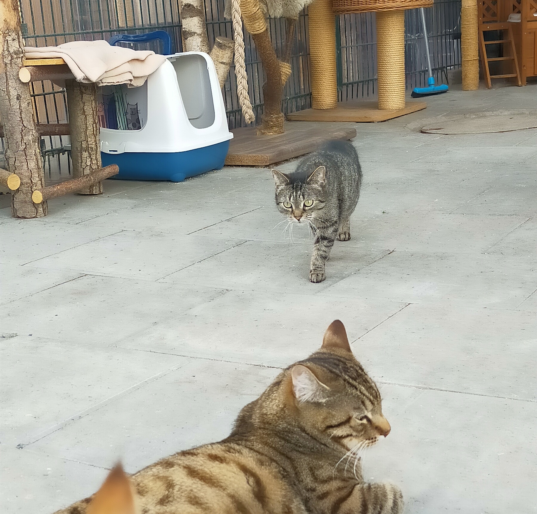 Zoe ist jetzt in den Katzenraum umgezogen, in dem auch Pauli und Patscho und auch Scarlett wohnen. Sie ist noch sehr zurückhaltend und hält sich etwas versteckt im Schrank auf. Aber mit etwas Ansprache kommt sie dort auch heraus, um ihr Umfeld ein wenig zu studieren. Den Katern gegenüber ist sie jedoch eher abweisend und faucht sie noch auf Abstand haltend an.