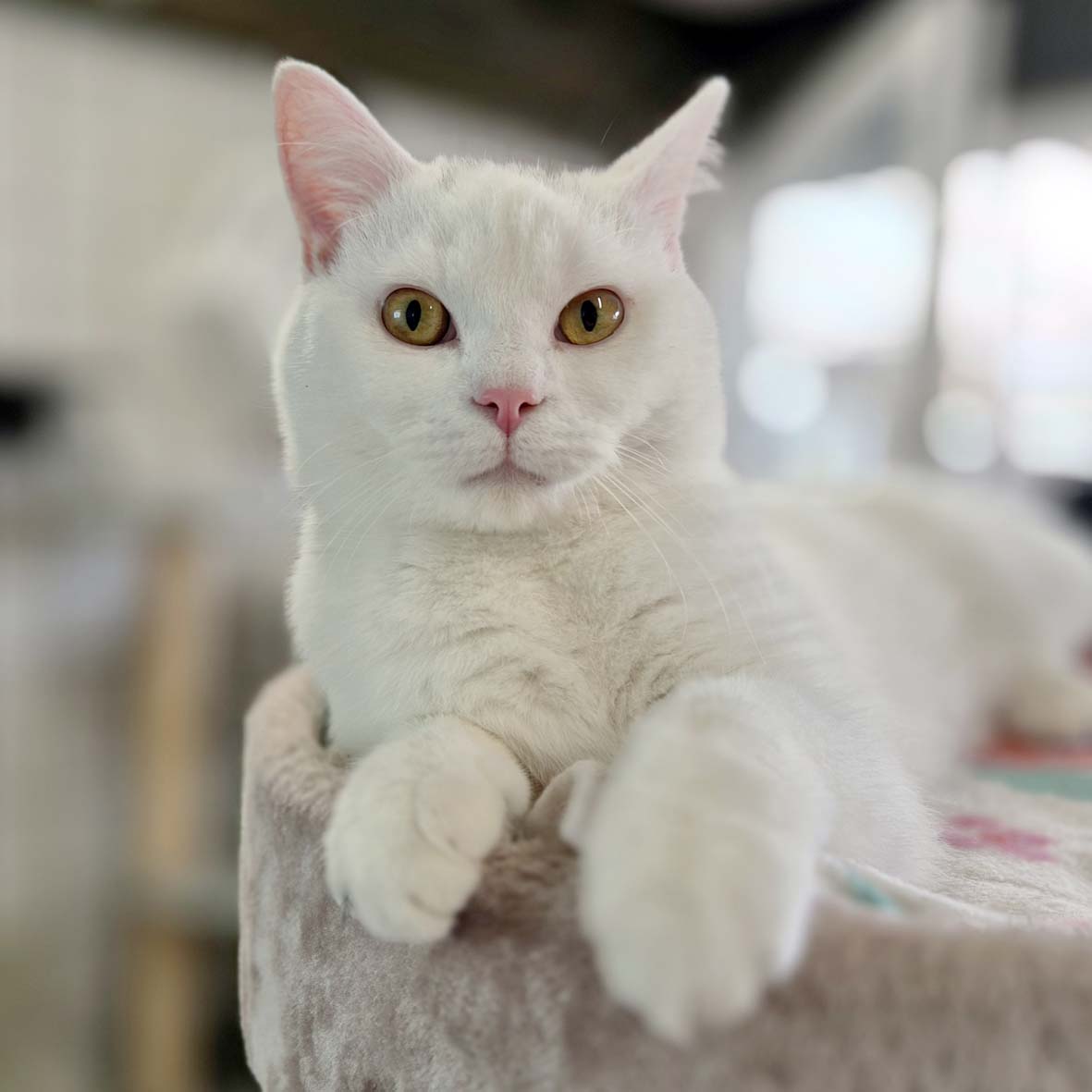 Der hübsche weiße, auf gute drei Jahre geschätzte Kater ist ausgesprochen menschenbezogen und verschmust. Im Umgang mit Artgenossen entscheidet er nach Sympathie. Wir können uns vorstellen, dass er gut mit einem Artgenossen zusammenleben kann, wenn es vom Charakter und Temperament harmoniert.