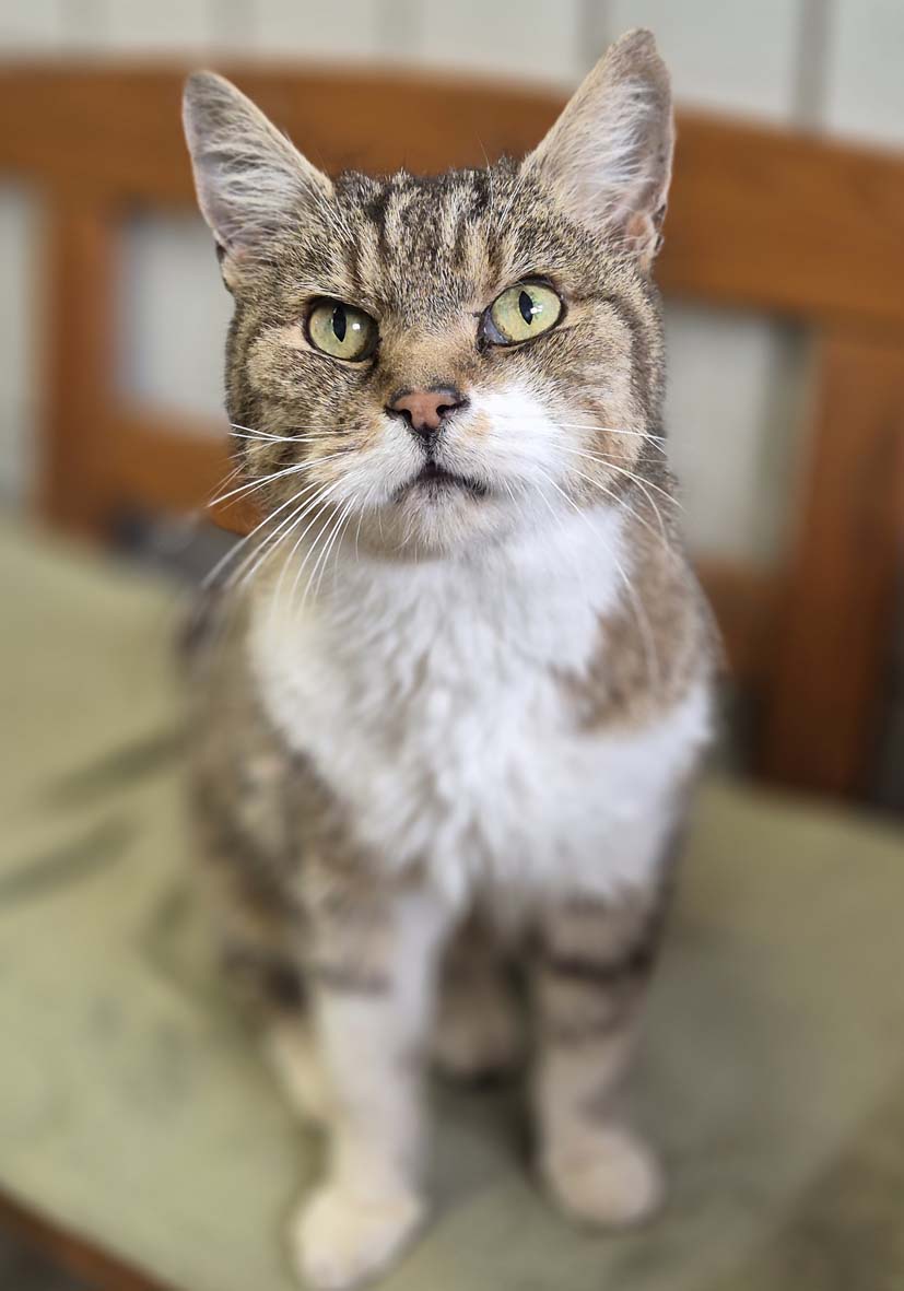 Ein genaues Alter haben wir für den Fundkater nicht, aber es ist offensichtlich, dass er im fortgeschrittenen Alter ist. Das mag auch ein Grund sein, dass Leandro etwas mehr Pflege braucht. Auch wenn er dafür nicht im strengen Sinne dankbar ist, muss er bei der Fellpflege unterstützt werden. Dass er für “etwas mehr auf den Rippen” das ein oder andere Leckerchen bekommen sollte, entspricht da schon mehr seinen Vorstellungen.
