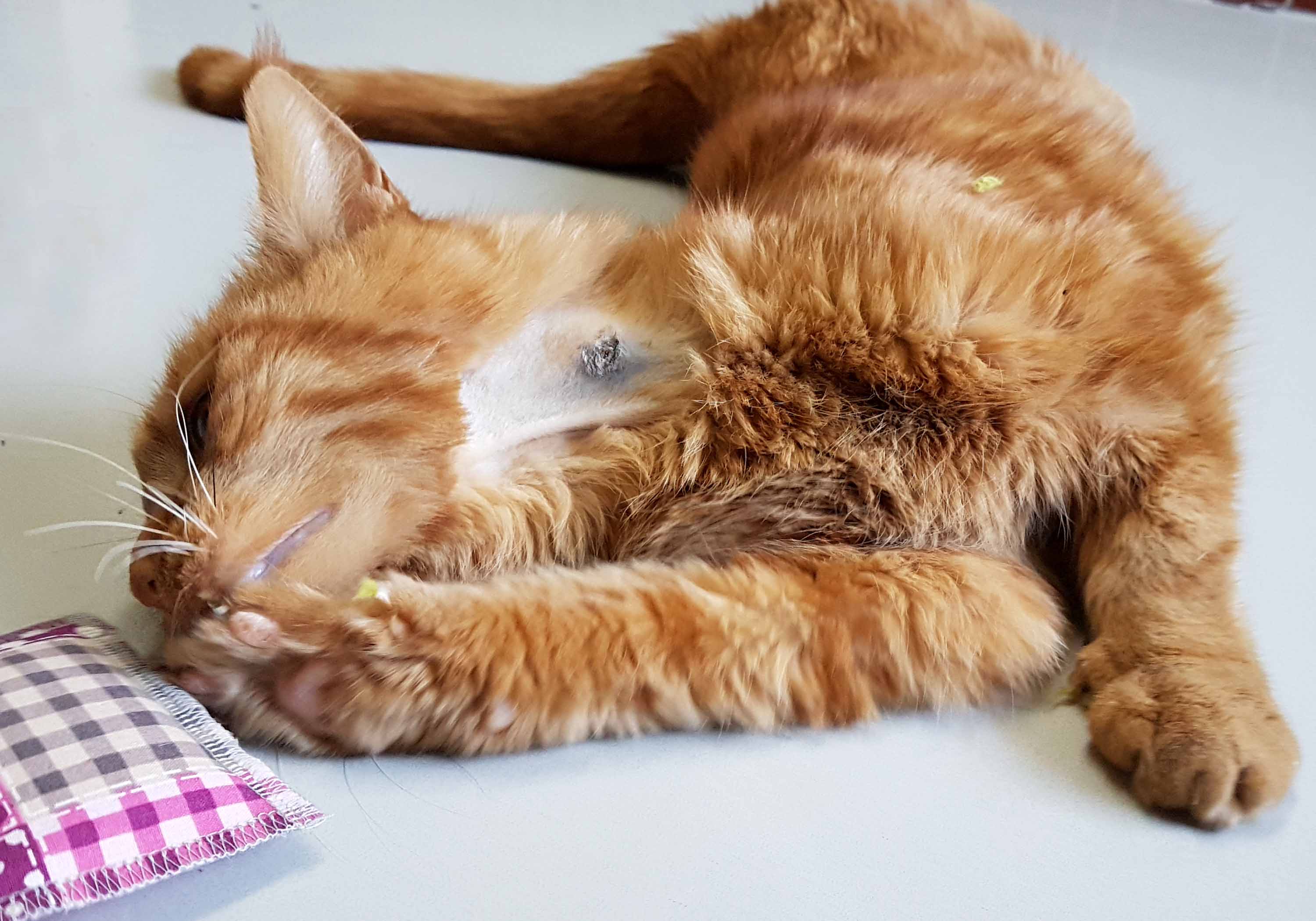 Samstag war Rebell so schwach, dass er keine Nahrung mehr zu sich nahm und wir ihn in die Tierklinik bringen mussten. Dort bekam der stark dehydrierte Kater eine Infusion und als er trotz der Flüssigkeitszufuhr nicht anfing zu fressen, musste eine Sonde gelegt werden, um ihn mit Nahrung zu versorgen.