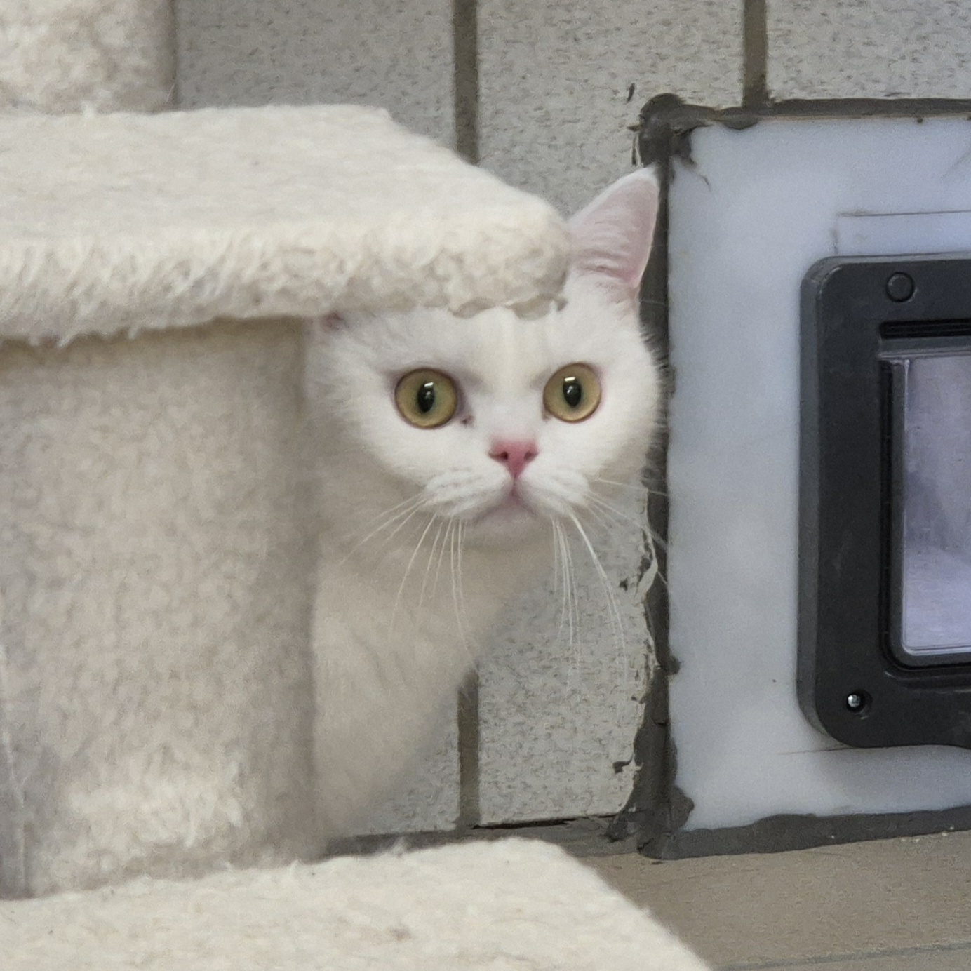 Wölkchen wurde zwischenzeitlich kastriert, geimpft und gechipt und konnte ins Katzenhaus umziehen. Hier zeigt sie sich durchaus verträglich mit den anderen Katzen, aber im Allgemeinen etwas nervös. Vielleicht muss sie sich einfach noch mehr an die neue Umgebung gewöhnen.