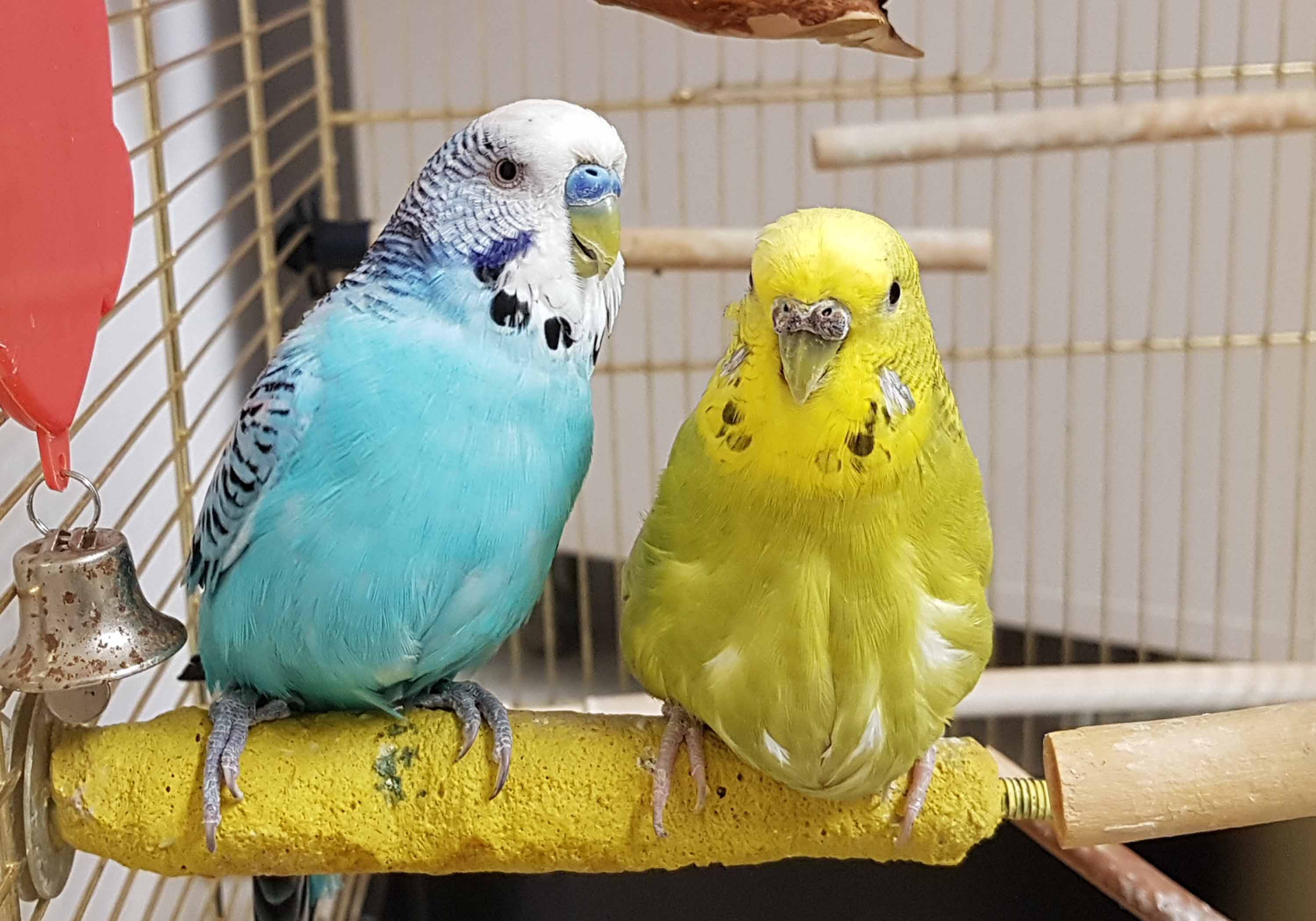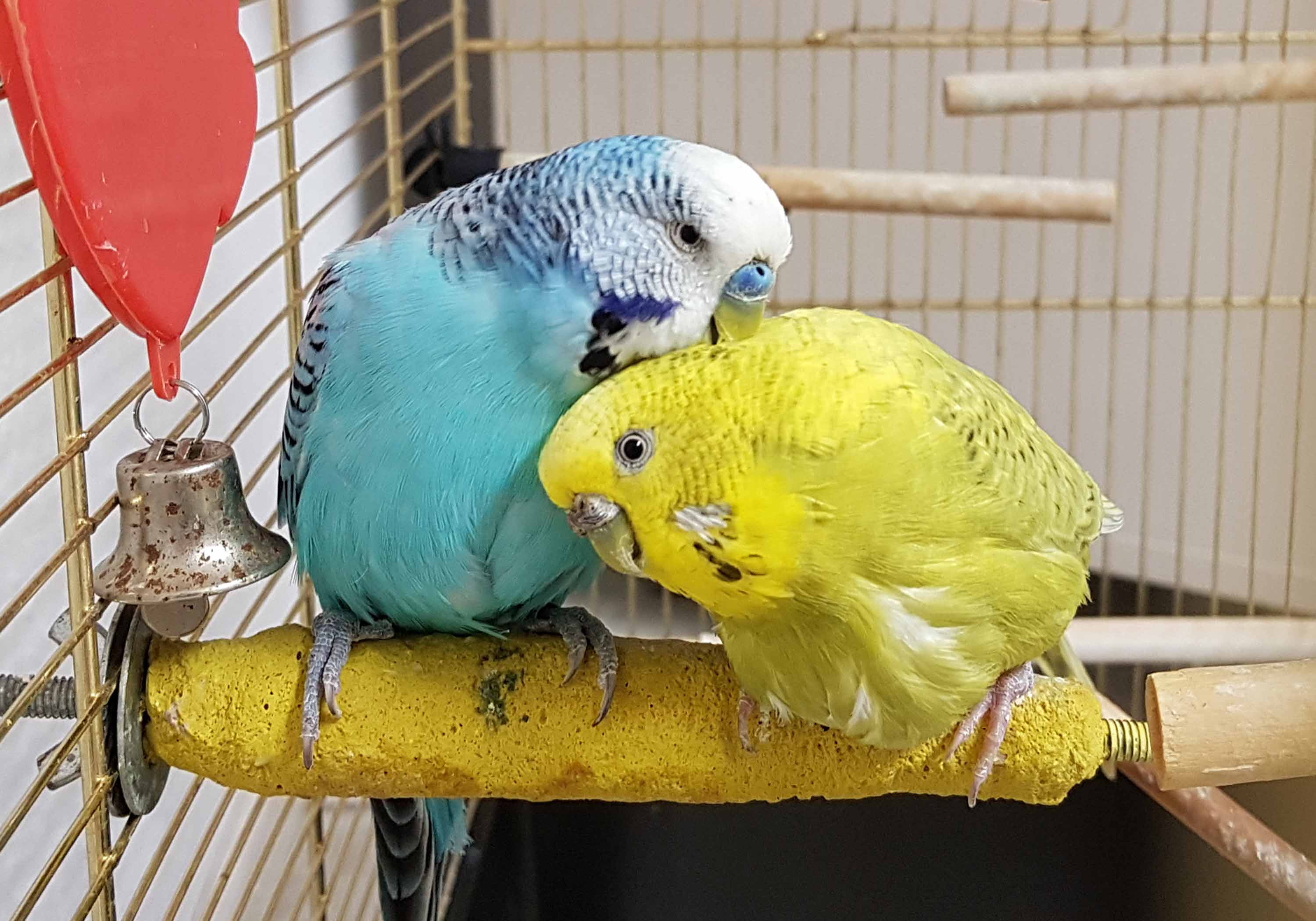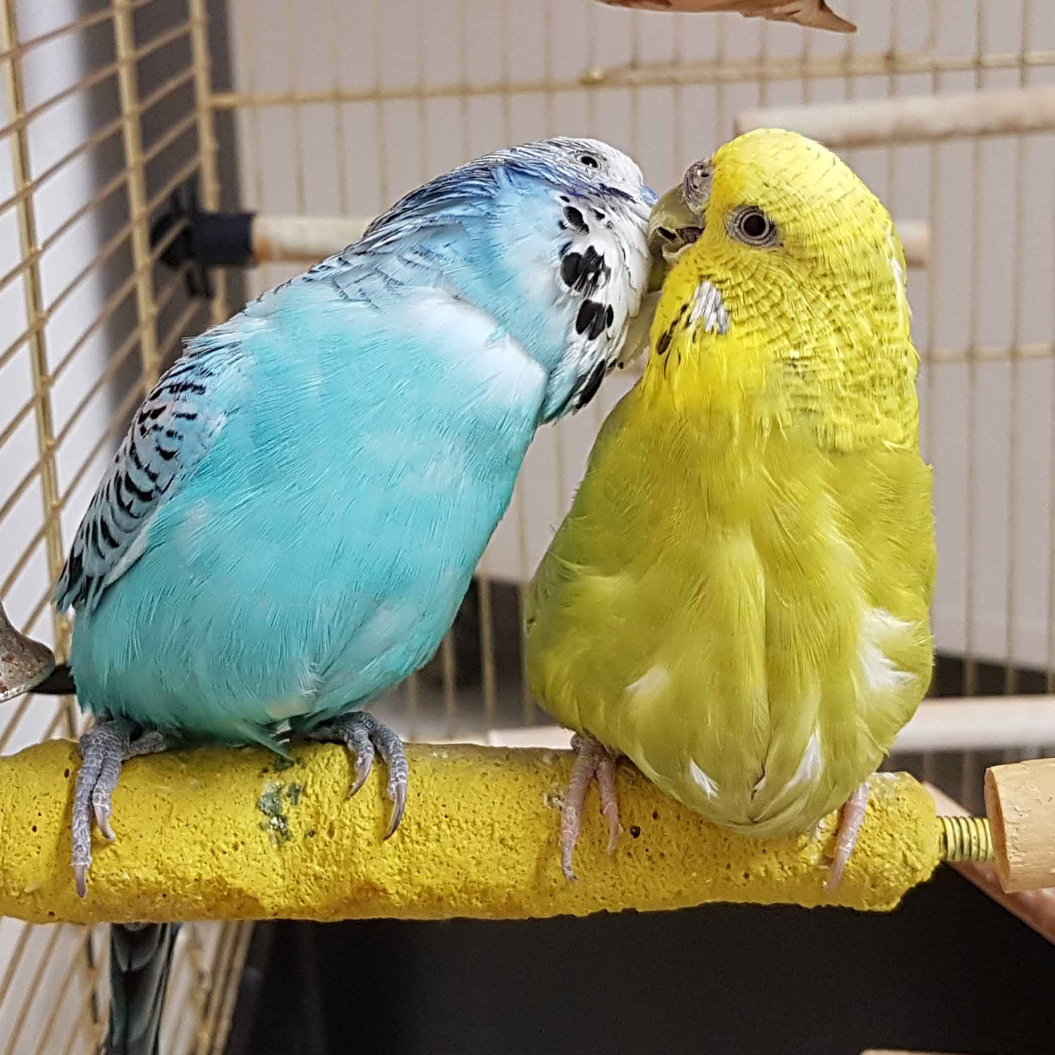 Diese beiden Wellensittiche herzen sich, wann immer sie können. Sie suchen eine neue Unterkunft mit genügend Freiraum und Flugmöglichkeiten.
