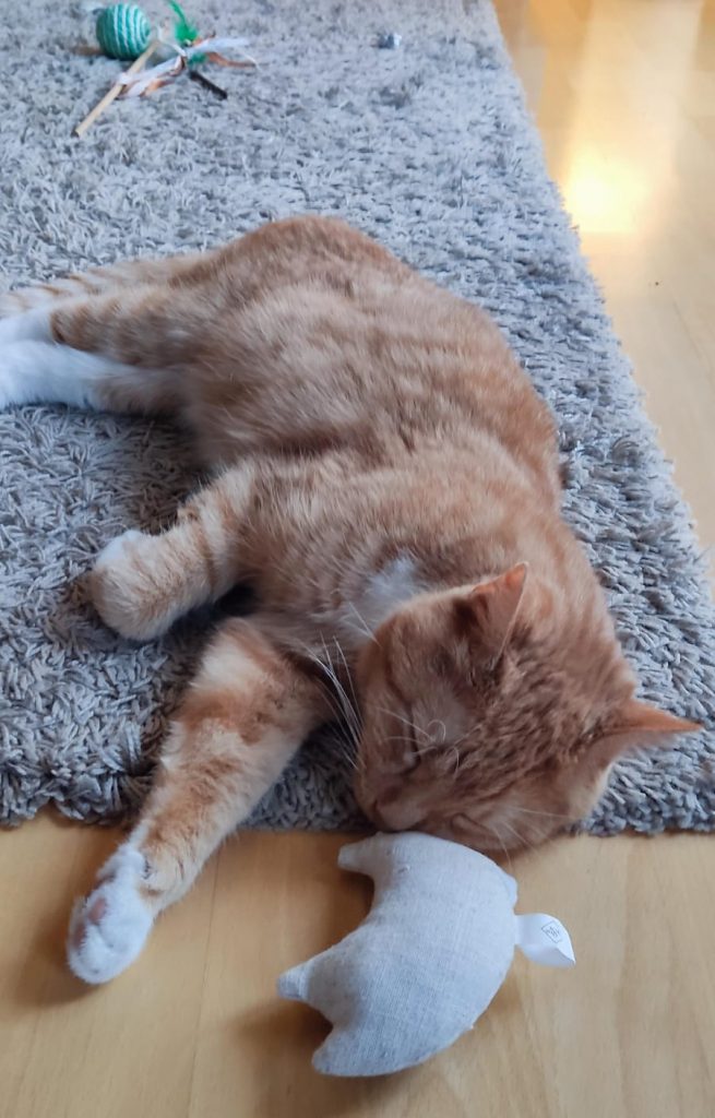 am 2.11.24 haben wir Jimmy und Prinz Harry aus dem Katzenhaus zu uns nach Hause geholt. Beide sind von Anfang an lieb und zutraulich, Jimmy ist offener und verschmuster als sein Kumpel Harry. Der taut aber immer mehr auf und lässt sich gerne den Bauch kraulen. Beide spielen und toben gerne und bringen uns ihr Spielzeug. Jimmy kam schon mit Untergewicht und Durchfall zu uns, inzwischen ist er sehr gut mit Medikamenten für seine Schilddrüse und Bauchspeicheldrüse eingestellt. Außerdem bekommt ein spezielles Futter und wir hoffen, dass er etwas zunimmt. Wiegen macht ihm übrigens Riesenspaß, da jeder Korb oder Karton sofort ausprobiert werden muss. Im Frühjahr dürfen die beiden dann auch nach draußen in den Garten. Sie machen uns sehr viel Freude und genießen die Ruhe bei uns. Wir freuen uns auf eine hoffentlich schöne lange Zeit mit den Jungs.