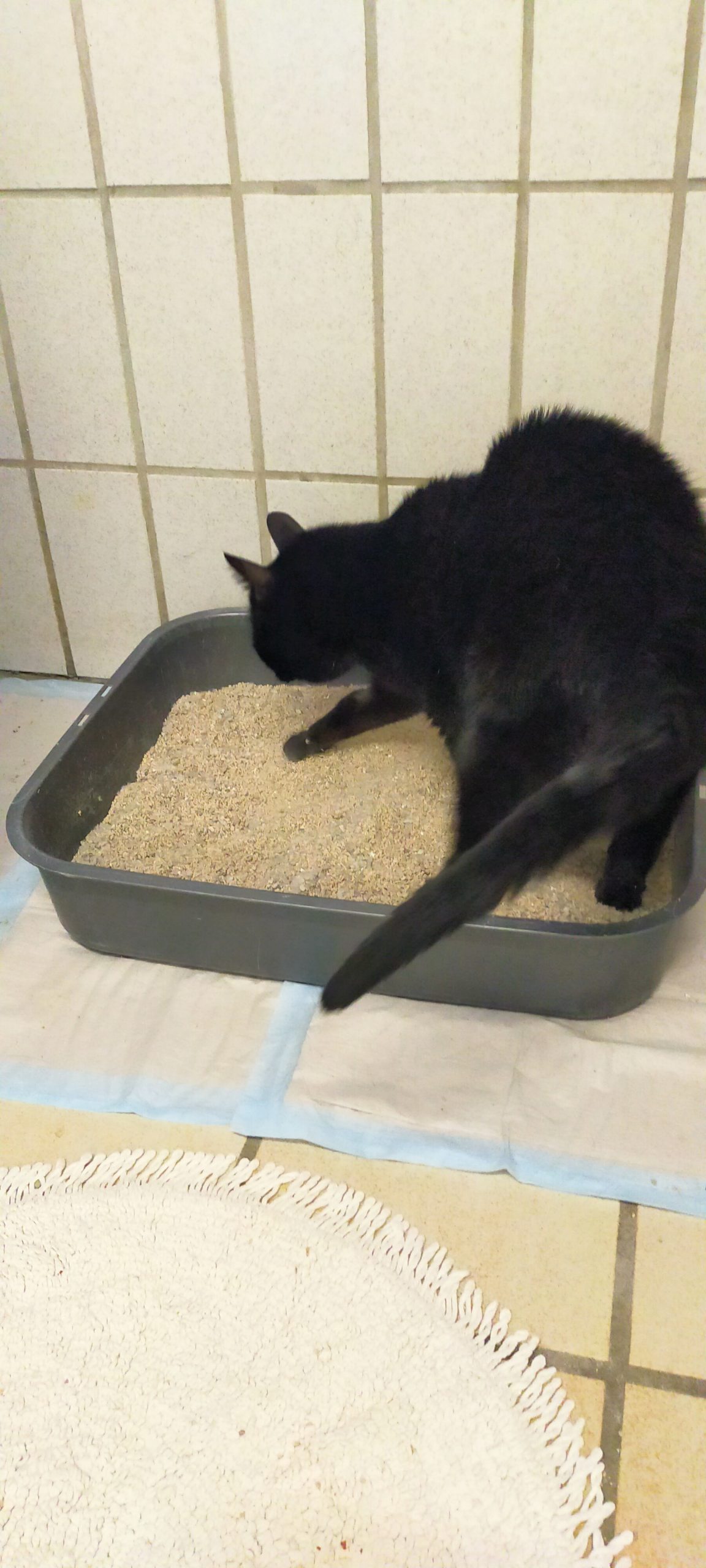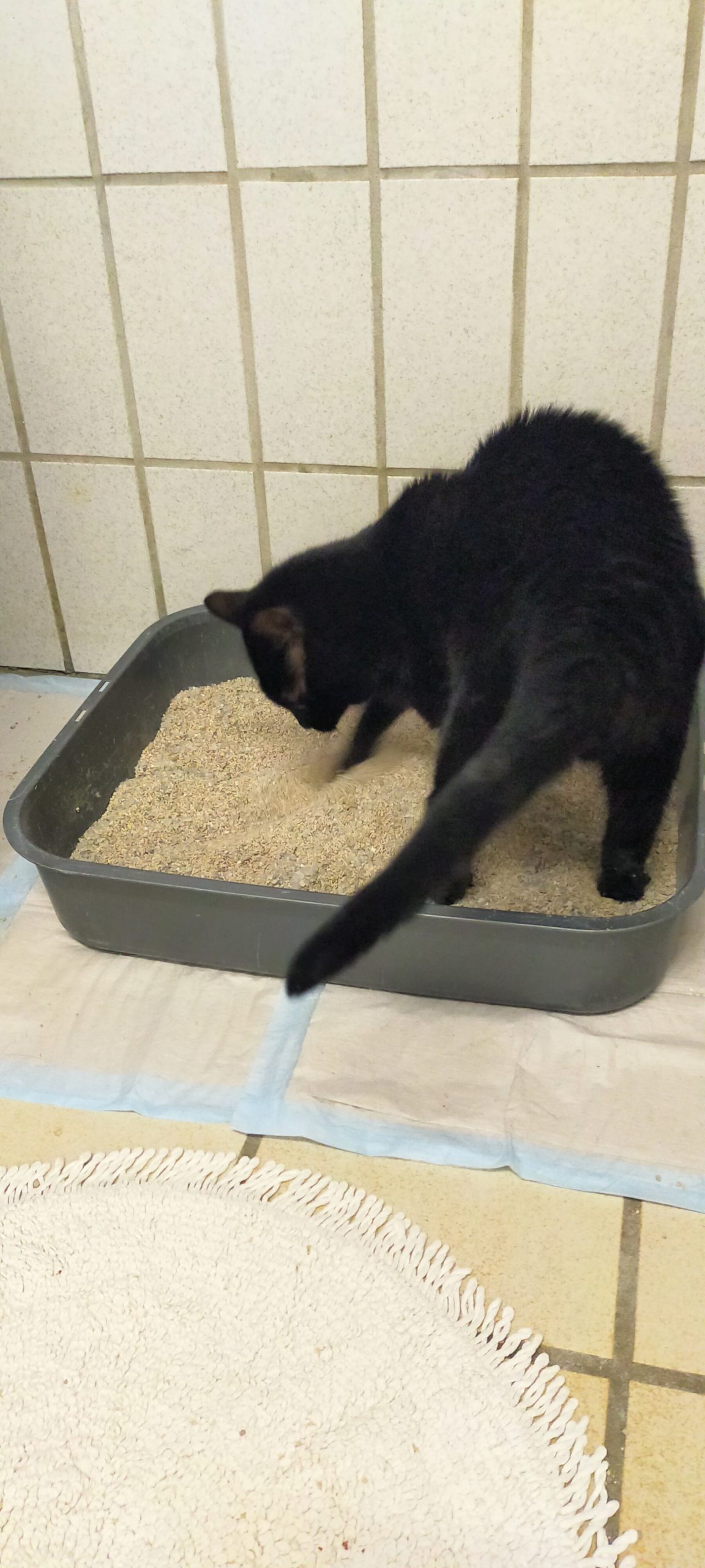 Klecks hat sich prima eingelebt. Er hat einen überschaubaren Raum für sich alleine, in dem er sich gut orientieren kann. Blind und taub zu sein ist natürlich eine Herausforderung, aber wie so oft, finden Tiere ihre Lösungen dafür. Klecks findet durch seinen Geruchssinn sein Futter und auch seine Katzentoilette, die er sicher benutzt.