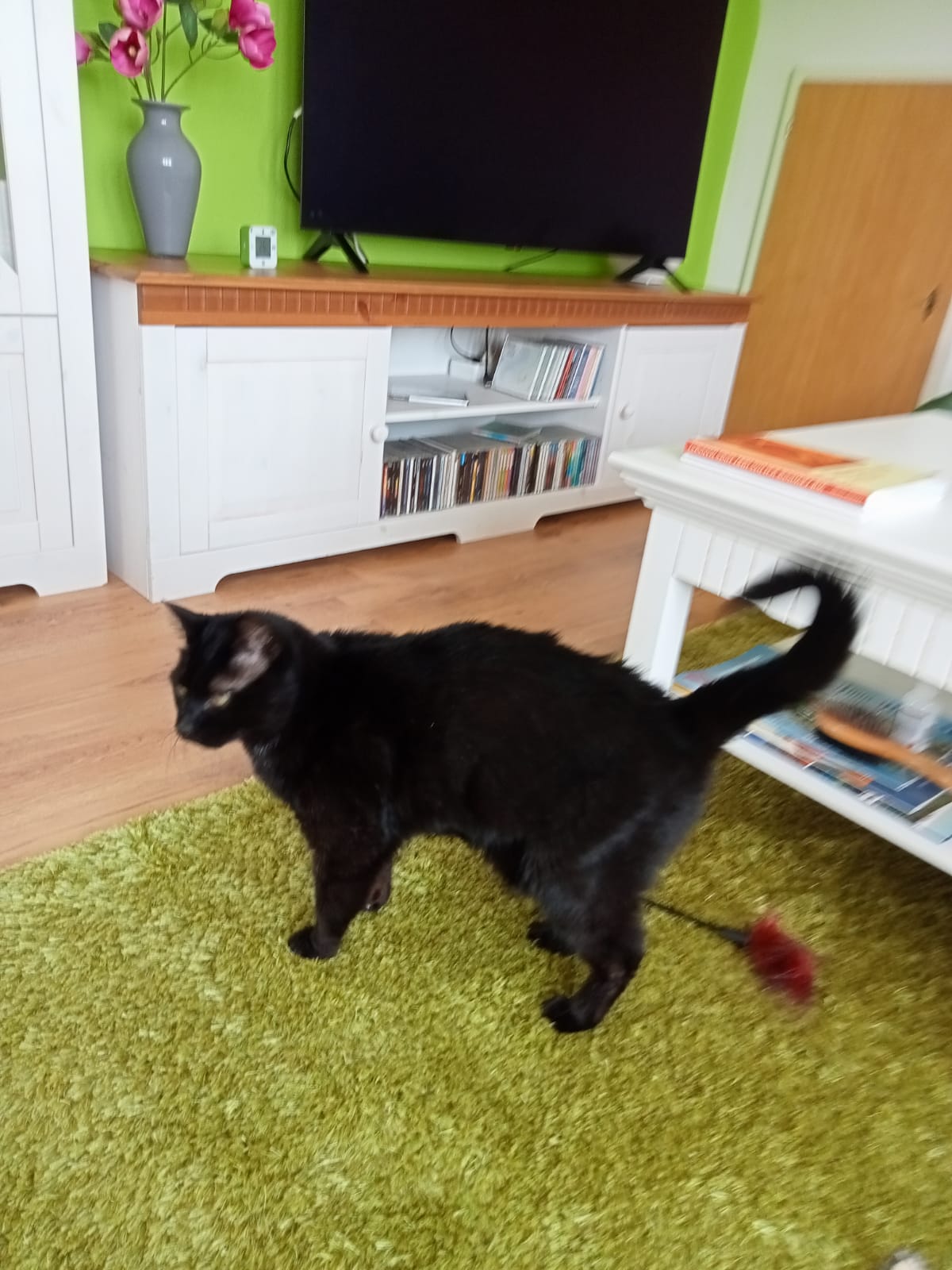 Klecks wird immer sicherer im neuen Zuhause. Mittlerweile schläft er nachts auch durch. Hat sich im Wohnzimmer die Couch dazu ausgesucht. Und sieht man ihn spielen, glaubt man kaum, dass er blind und taub ist. Vielleicht kann er doch noch leichte hell/dunkel Schatten erkennen. Das würde auch erklären, dass er ganz begeistert von Zeichentrickfilme ist.