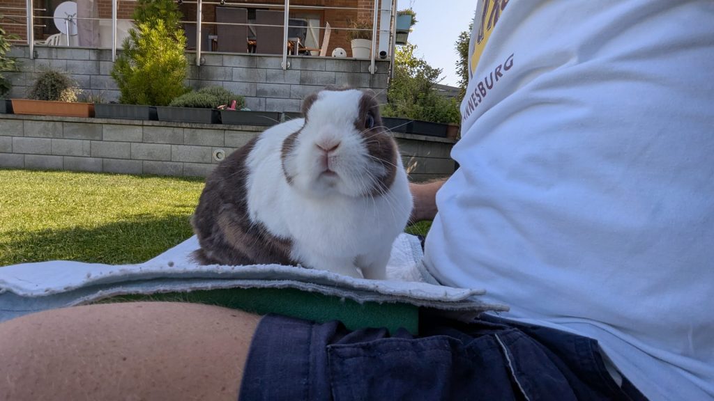 Und nach wie vor scheint Klößchen – eigentlich untypisch für Kaninchen – sehr gerne gestreichelt zu werden, springt einem dafür sogar auf den Schoss und schmeißt sich neben einem auf die Seite und lässt sich dann krabbeln. Er frisst uns aus der Hand und schleckt die Hose oder auch die Hand oft ab. Das aggressive Verhalten von ihm ist fast ganz weg. Nur wenn man ihn nicht streichelt und ihm keine Aufmerksamkeit schenkt – auch nicht wenn er einen mehrfach mit der Nase am Bein stupst – dann zupft er einem energisch am Hosenbund. Wir vermuten einfach er fordert jetzt die Aufmerksamkeit ein, was ihm zuvor bei den ursprünglichen Besitzern nicht gegönnt war. Letztens saß er meiner Frau fast eine halbe Stunde auf dem Schoss.