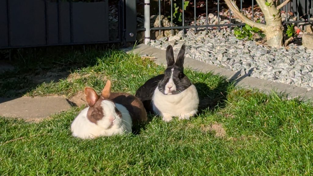 Die beiden können den ganzen Garten (~340qm) mindestens 2mal am Tag als Auslauf nutzen, wovon gerade Klößchen fast immer gebrauch macht. Nur wenn’s Regnen schaut er einen strafend an und bleibt lieber im Gehege im trocknen … halt beides Schönwetter Kaninchen.