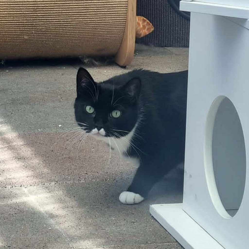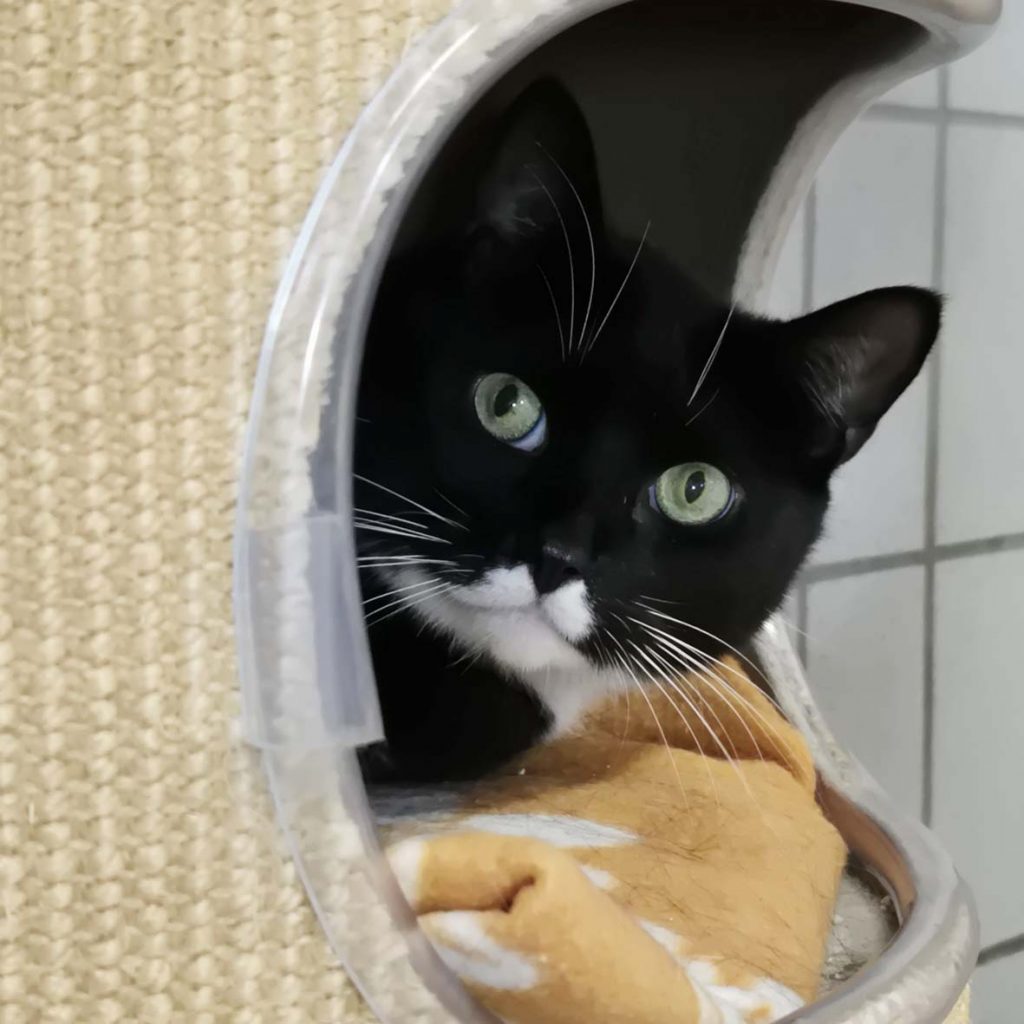 Inzwischen konnte Louie ins Katzenhaus umziehen und darf sich nun erst einmal in Ruhe akklimatisieren. Wir wissen, dass er im alten Zuhause mit seiner Bezugsperson verschmust war, und dass er es sehr genossen hat, täglich auf den Balkon zu dürfen, um sich ein wenig “Freiheit” um die Nase wehen zu lassen.