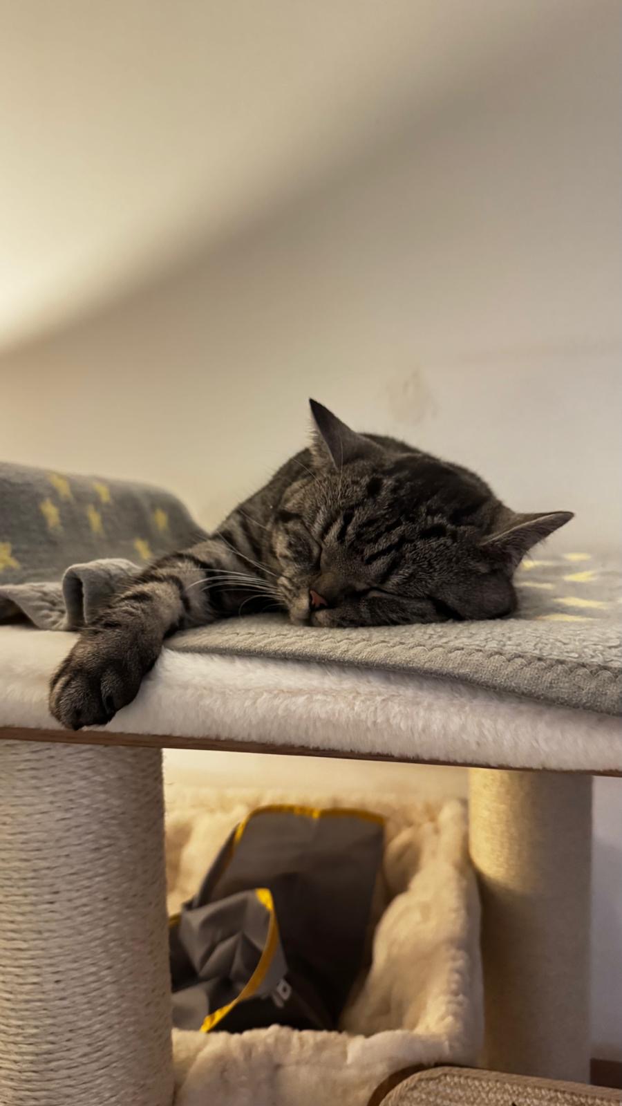 Und auch über die gesamte Zeit hat Lupin sich hervorragend entwickelt. Er liebt seinen Kratzbaum, wälzt sich unglaublich gerne auf seiner Liegefläche hin und her und hat von dort stets sein ganzes Revier im Blick.