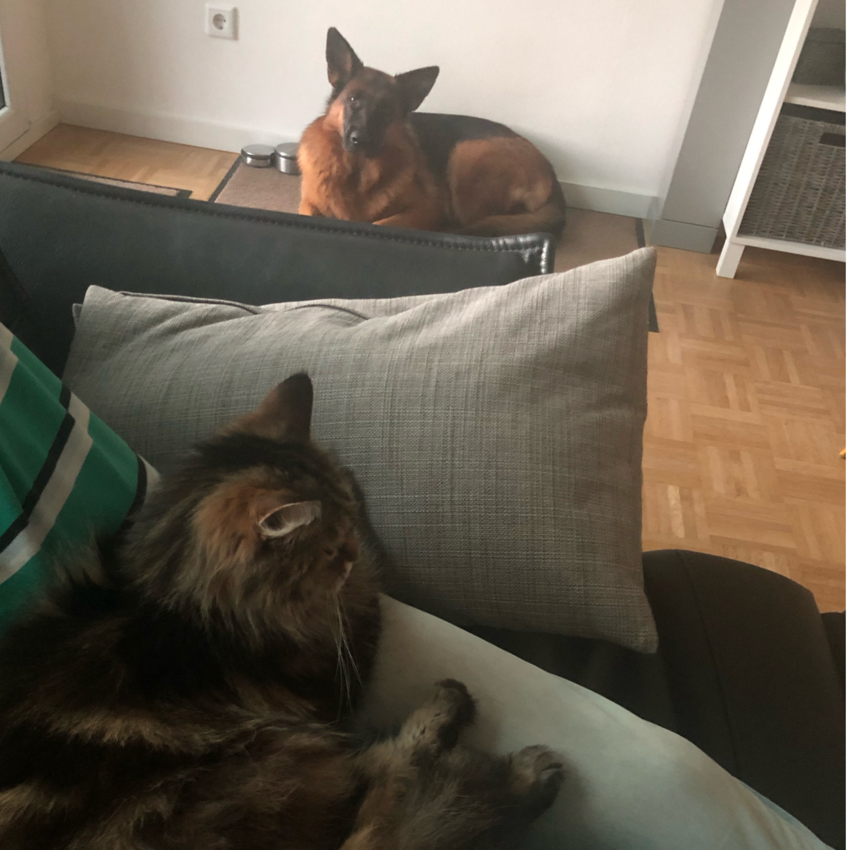 dazugehört…allerdings hat Minka noch ziemlich Respekt vor ihr. Aber sie bleibt mindestens in genügend Abstand entspannt liegen…wenn es ihr zu doll wird verkrümelt sie sich nach oben (Hundfreie Zone)