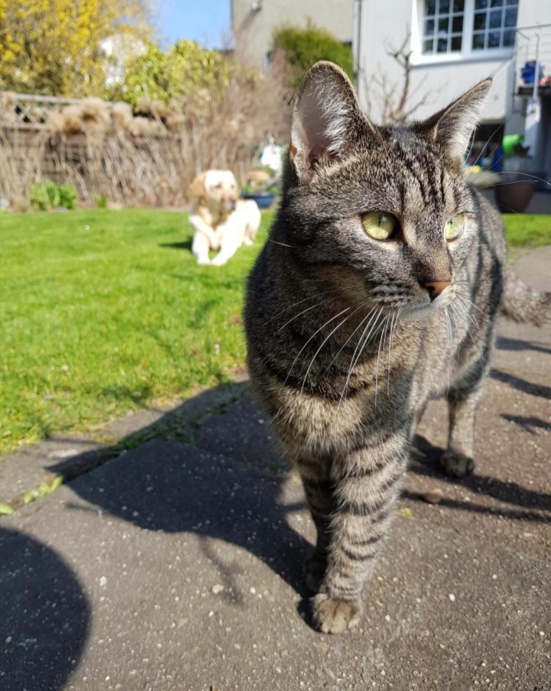 Unsere Katze Maggy nähert sich immer mehr an und spielt gelegentlich mit den beiden im Wohnzimmer. Unser Hund