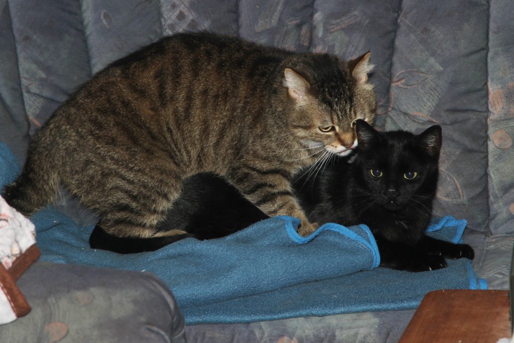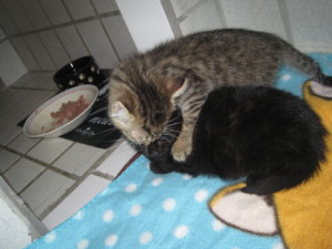 wer von Ihnen war schon vor 10 Jahren hier im Tierheim? Nachdem meine beiden Kater ihren 10 Geburtstag gefeiert haben, dachte ich daran, mich einmal bei Ihnen zu melden. Jojo und Tarzan hießen damals die beiden bei Ihnen und waren mit ständigen Augenproblemen in einem Extrazimmer, nicht bei den anderen Kitten. Im Sommer 2015 habe ich die beiden geholt und Sisley und Renoir genannt. Sisley (Jojo) ist leider ein medizinisch aufwendiger Fall. Er hat Epilepsie, Asthma und FIV(Aids). Alles wohl von Geburt an. Er ist aber medizinisch optimal eingestellt und hat keinerlei Beschwerden. Zudem ist er vor einigen Jahren mit einer Stereobox abgestürzt und hat dabei seine Schwanzspitze verloren. Und letztes Jahr ist im bei Renovierungsarbeiten ein Hocker auf die Pfote gefallen mit dem Ergebnis, drei gebrochene Zehen. Jetzt hat er Nägel in den Zehen. Er schreit eben immer hier. Er ist der schmusigste Kater, den ich je hatte. Renoir (Tarzan), der schwarze, ist auch chronisch krank, er hat Bluthochdruck und ist auch medizinisch optimal eingestellt. Er war ja damals der scheuere von beiden und hat sich immer versteckt. Wenn ich Besuch kriege, versteckt er sich noch immer, aber mir gegenüber ist er total verschmust. Die Kater haben immer in einer Gruppe gelebt und Sisley hat nie jemanden mit FIV angesteckt, weil er nicht beißt, sodass ich es gewagt habe, vor zwei Jahren zwei Kitten zu holen. Sisley war von Anfang an vernarrt in die beiden und zur kleinen Cheyenne hat er eine echte Liebesbeziehung. Jeden Abend schmusen die beiden.