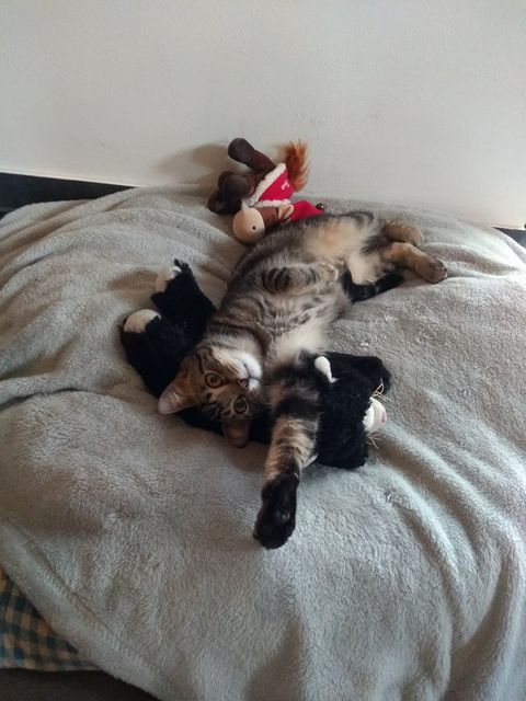 “Zazu sendet Liebe Grüße von seinem neuen Kratzbaum und seinem zweiten Lieblingsplatz – dem gemütlichen Kissen von Hund Jasper. In 2 Wochen geht es für Zazu das erste Mal hinaus in den Garten. Die Kastration diese Woche hat er super überstanden. 😃