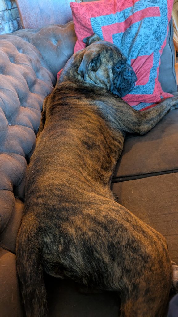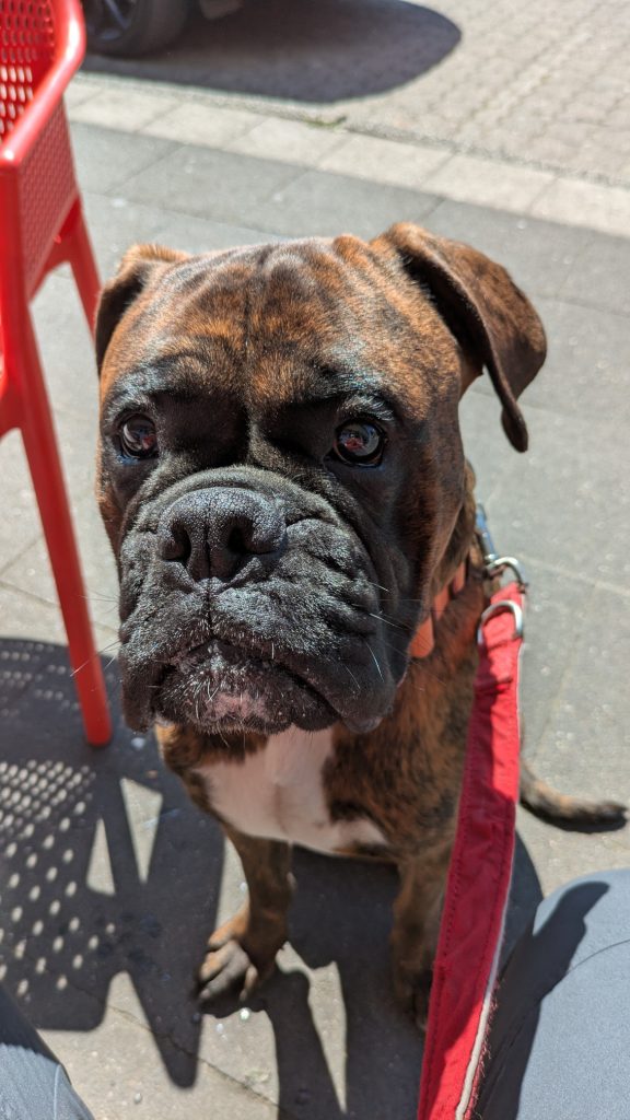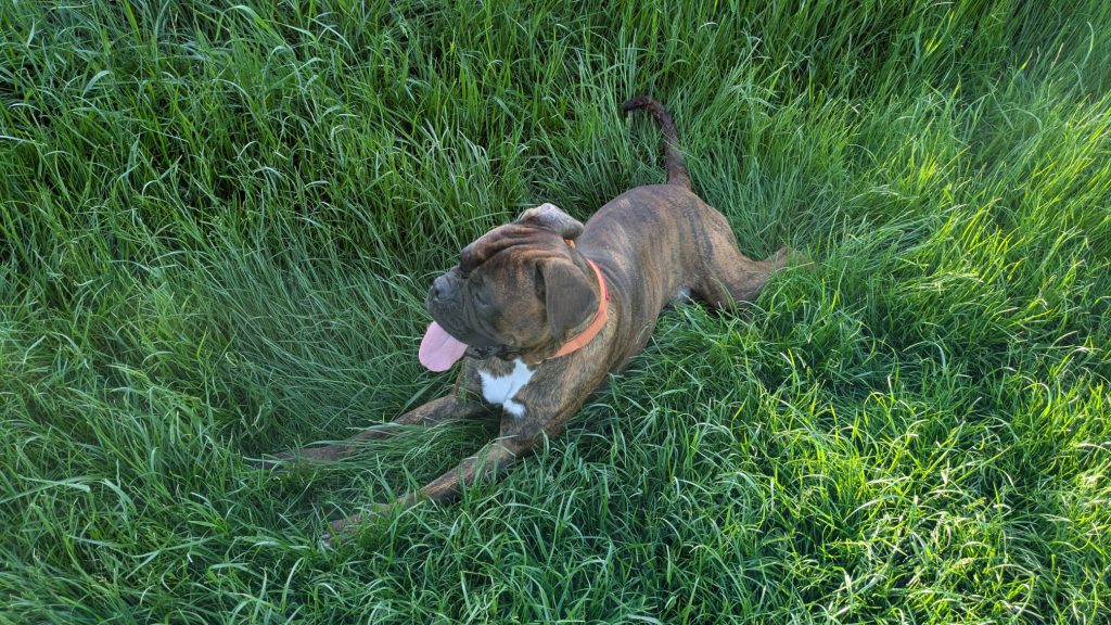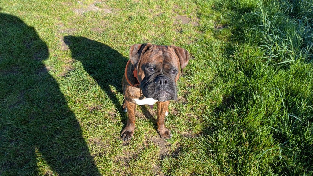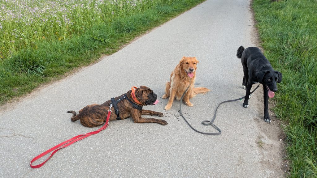 Scooby hat sich nach vier Wochen gut eingelebt, anbei habe ich ein paar Fotos mitgeschickt. Die Wiesen hinterm Haus findet er klasse, hören kann er auch schon recht gut, so das ich ihn da laufen lassen kann. Die ersten Trainings in der Hundeschule und in Einzeleinheiten haben sich ebenfalls schon bezahlt gemacht. Mit den Hunden in der Familie, Milo ein fünfjähriger Golden Retriever, Kalle ist im gleichen Alter wie Scooby und ein Labrador-Kangal-Mix, versteht er sich sehr gut.