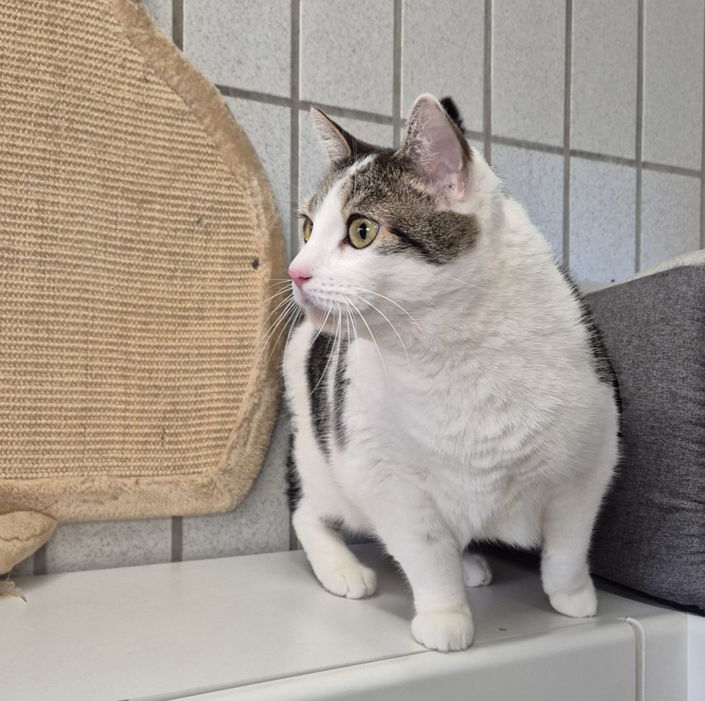 Die anderen Katzen interessieren ihn bisher wenig. Wir könnten uns vorstellen, dass er gut mit oder neben einer ähnlich entspannten Erstkatze leben könnte.