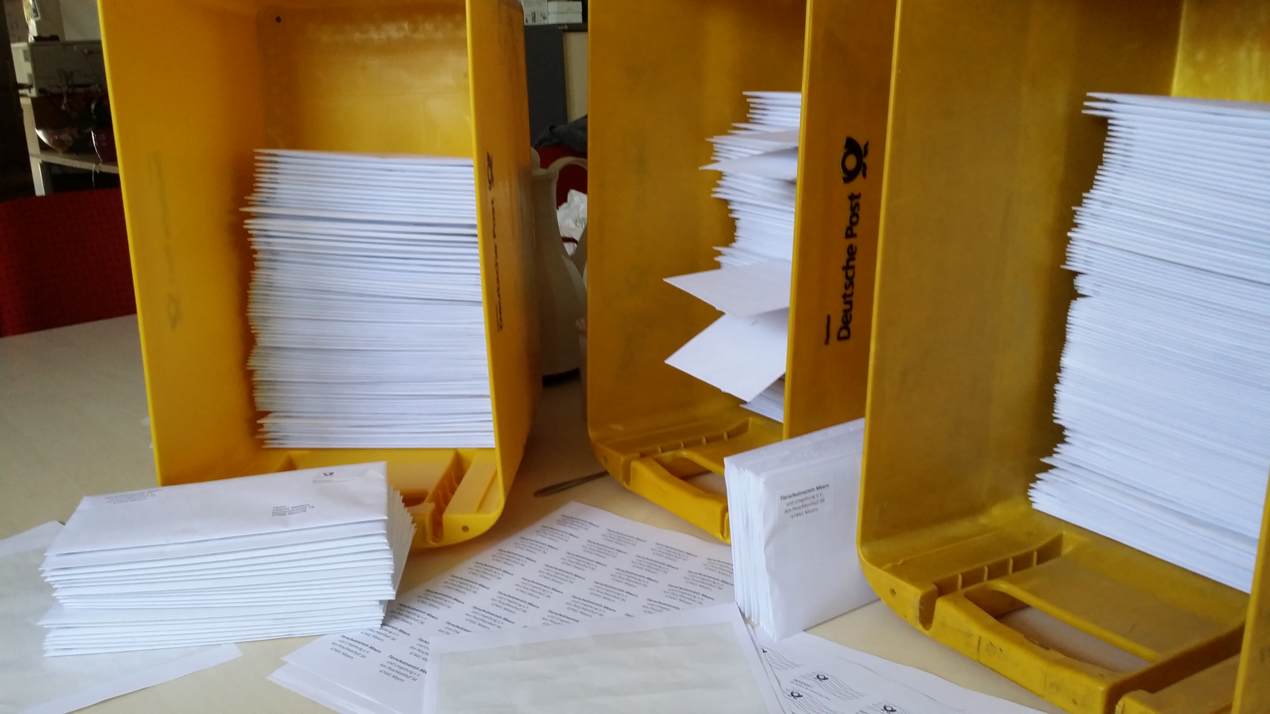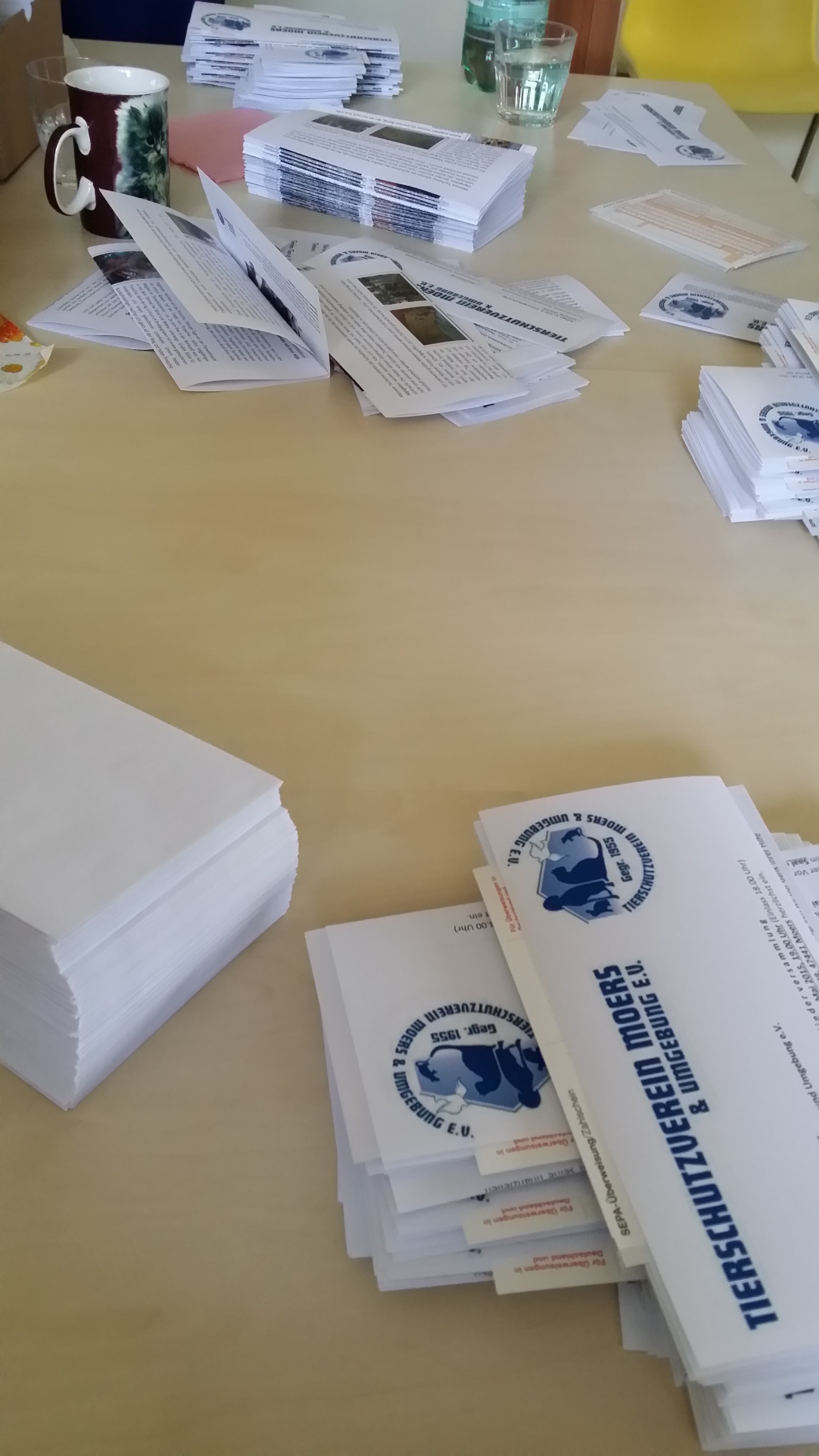 Gestern habe ich zusammen mit dem Vorstand rund 1.100 Einladungen für die bevorstehende Jahreshauptversammlung des Tierschutzvereins versandfertig gemacht. Einladung, Satzung, Ergänzung zur Tagesordnung, Tierheim-Blitzlicht und nicht zu vergessen ein Überweisungsträger… wenn ich nicht aufgepasst hätte, würden die Vorständler wohl heute noch eintüten. “Mir frieren die Zehen ab!”, “Das ist zu langweilig!”, “Ich habe mich verklebt!”, “Ich habe huuuuunger…!” – mit Frauen zu arbeiten kann ganz schön anstrengend zu sein – aber ich bin ja einiges gewohnt. Montag muss ich dann noch die nacharbeiten machen, damit die Dinger flott zur Post gebracht werden können.