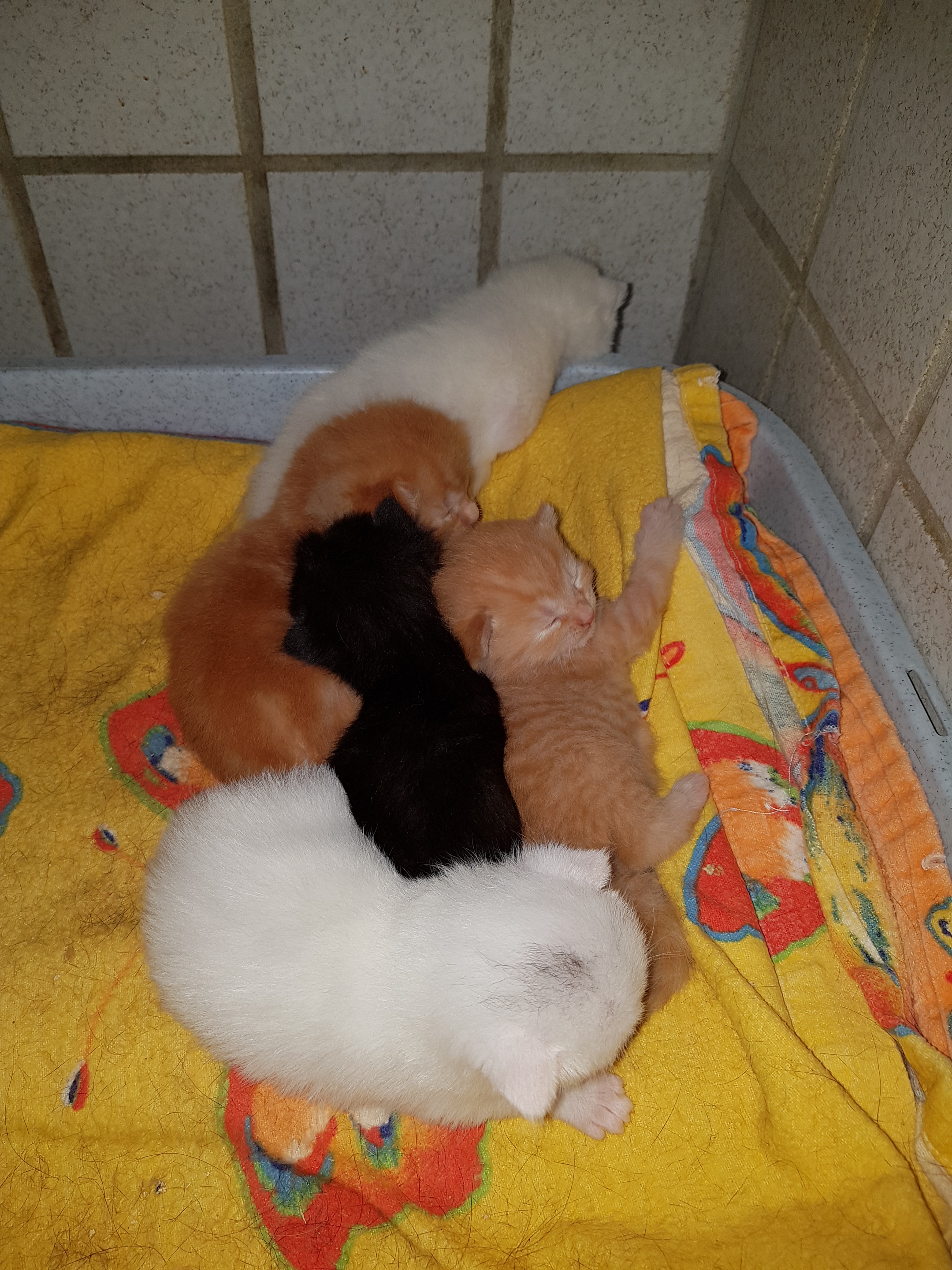 Diese Kleinen wurden bei uns im Tierheim geboren und haben die ersten 3 Wochen ihres Lebens überstanden. Das heisst noch nicht, dass sie “übern Berg” sind. Ein großer Vorteil ist natürlich, dass sie ihre Mama mit dabei haben. Sie kümmert sich liebevoll um alle fünf hungrigen Mäulchen. Die nächsten Wochen sind ausschlaggebend und wenn sie ihre erste Impfung gut überstanden haben (mit etwa 8 Wochen) , werden wir bekannt geben, wann sie zur Vermittlung stehen.